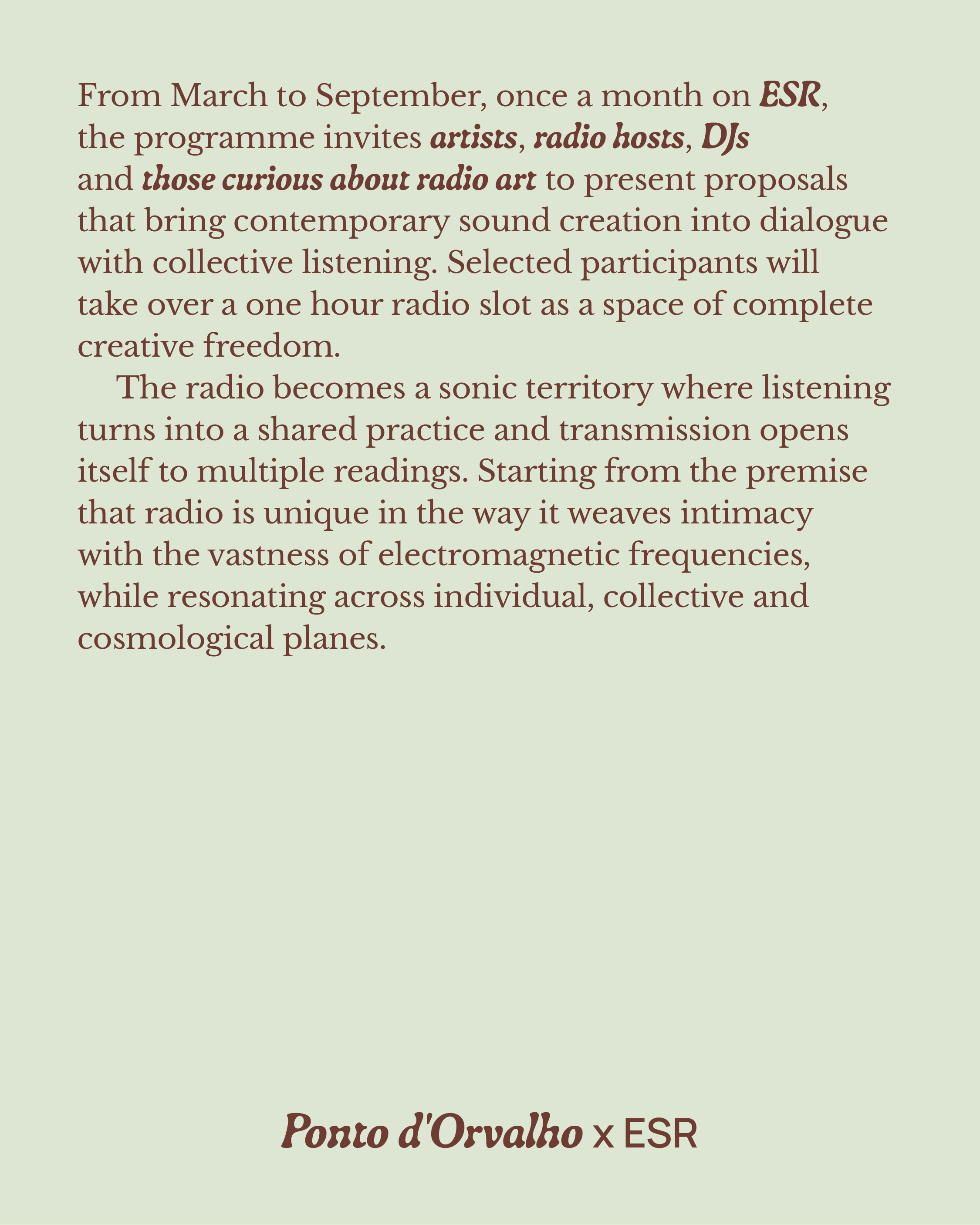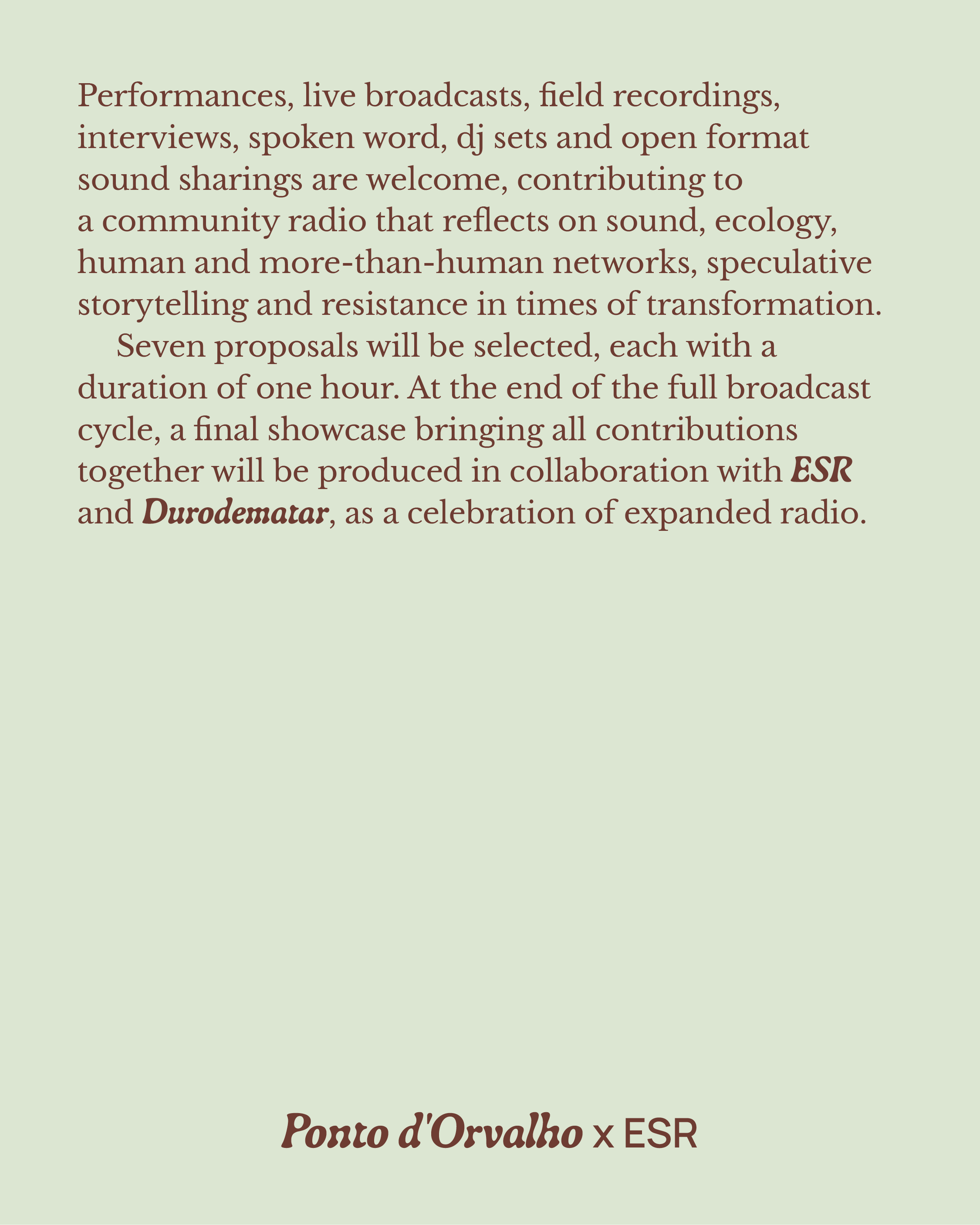 Os programas de rádio são dedicados aos temas do festival Ponto d’Orvalho, explorando as intersecções entre música, ecologia e práticas de escuta. Através de gravações de campo, texturas ambientais, sons exploratórios e entrevistas, destacamos artistas dos nossos programas, referências que nos inspiram, e celebramos novos lançamentos e artistas emergentes.