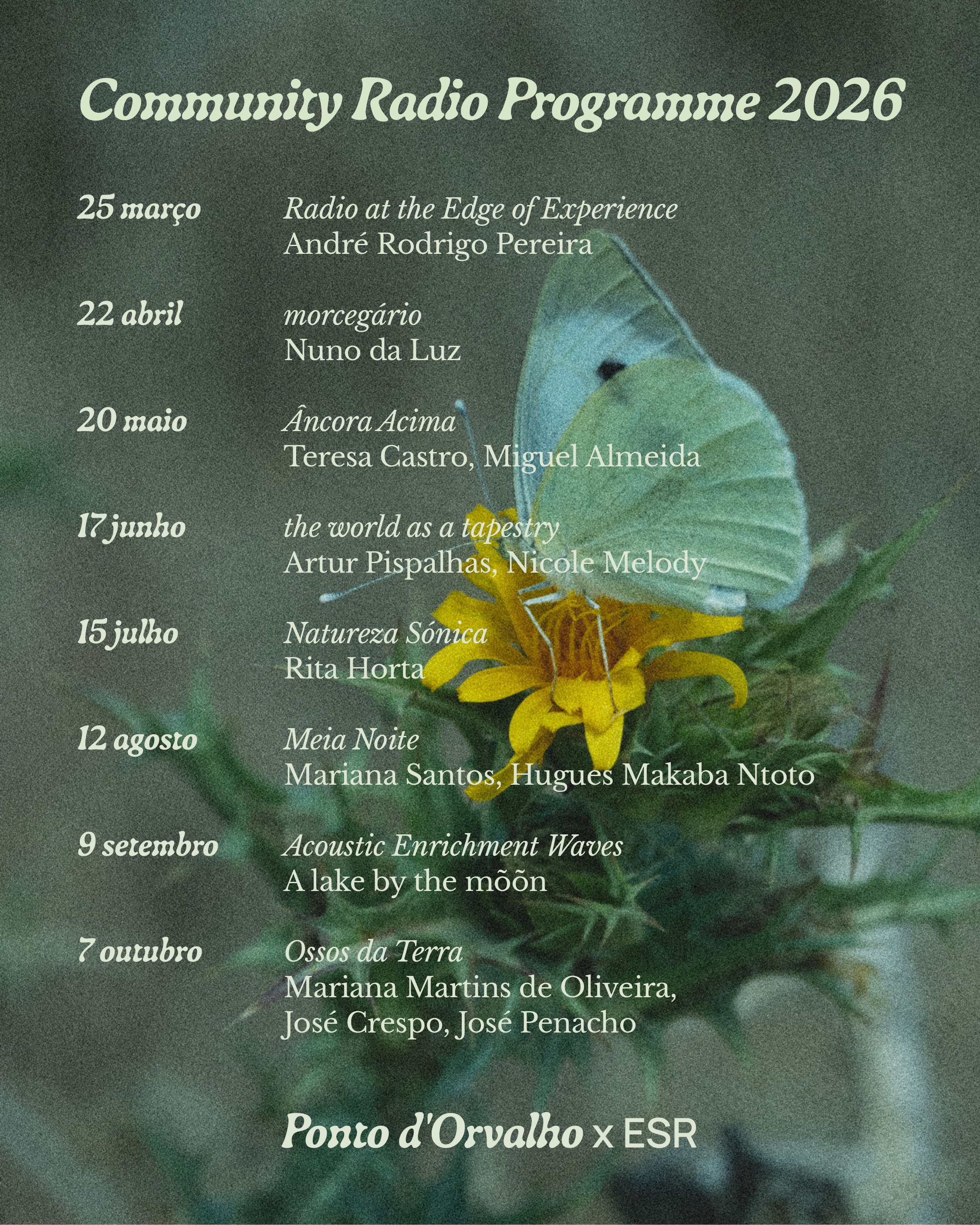 É com prazer que anunciamos os projetos selecionados para a Community Radio 2026. Este é o início de uma viagem por explorações sonoras e práticas de escuta coletiva, expandindo a rádio enquanto meio artístico e espaço de partilha e encontro. De março a outubro, oito artistas e coletivos vão habitar as frequências da ESR - uma vez por mês, sempre às 16h00.