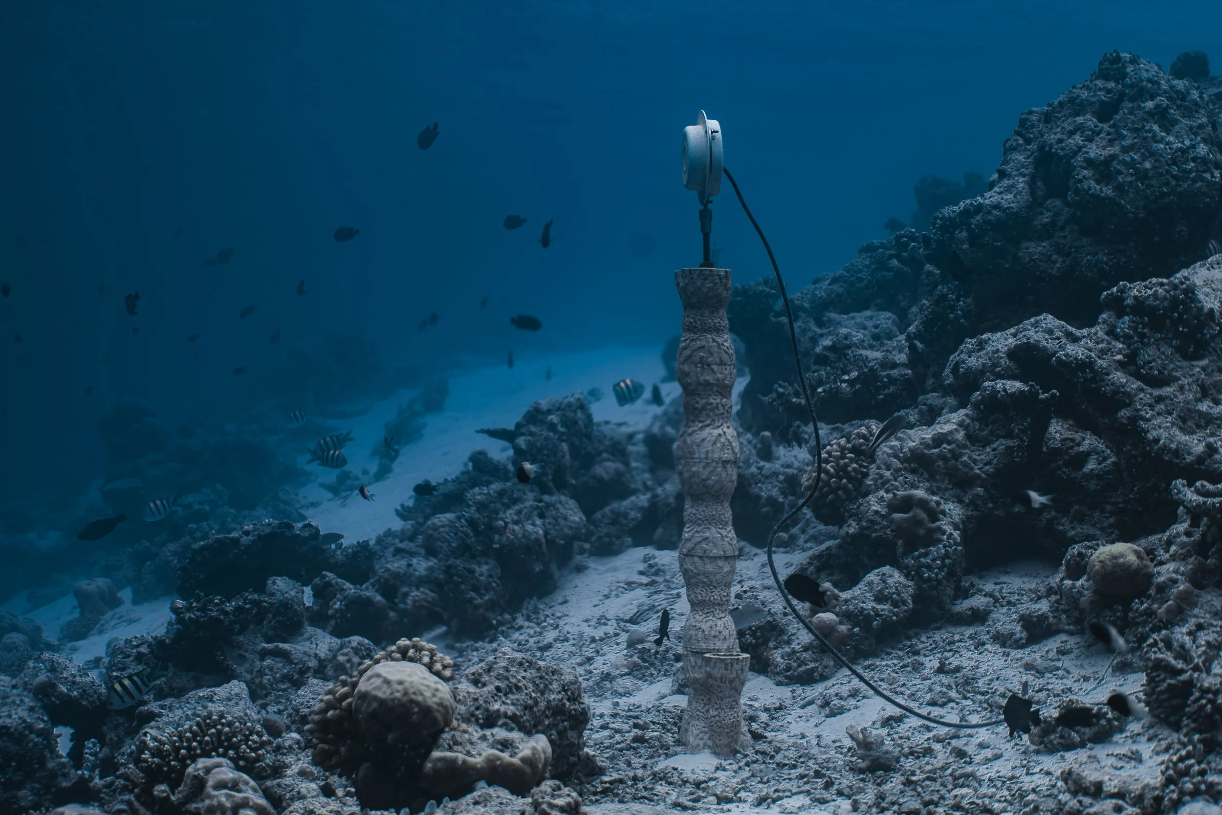 Num recife a poucos metros de onde quebram as ondas, abundam os sons da vida - o estalar das garras dos camarões, os guinchos dos peixes, zumbidos, grunhidos, chamamentos. Esta é a paisagem sonora de um recife saudável, e tem sido reproduzida em recifes mortos através de colunas subaquáticas, atraindo organismos em fase de colonização e ajudando a repovoar ecossistemas debilitados. A esta técnica de restauro ecológico chama-se "Acoustic Enrichment".