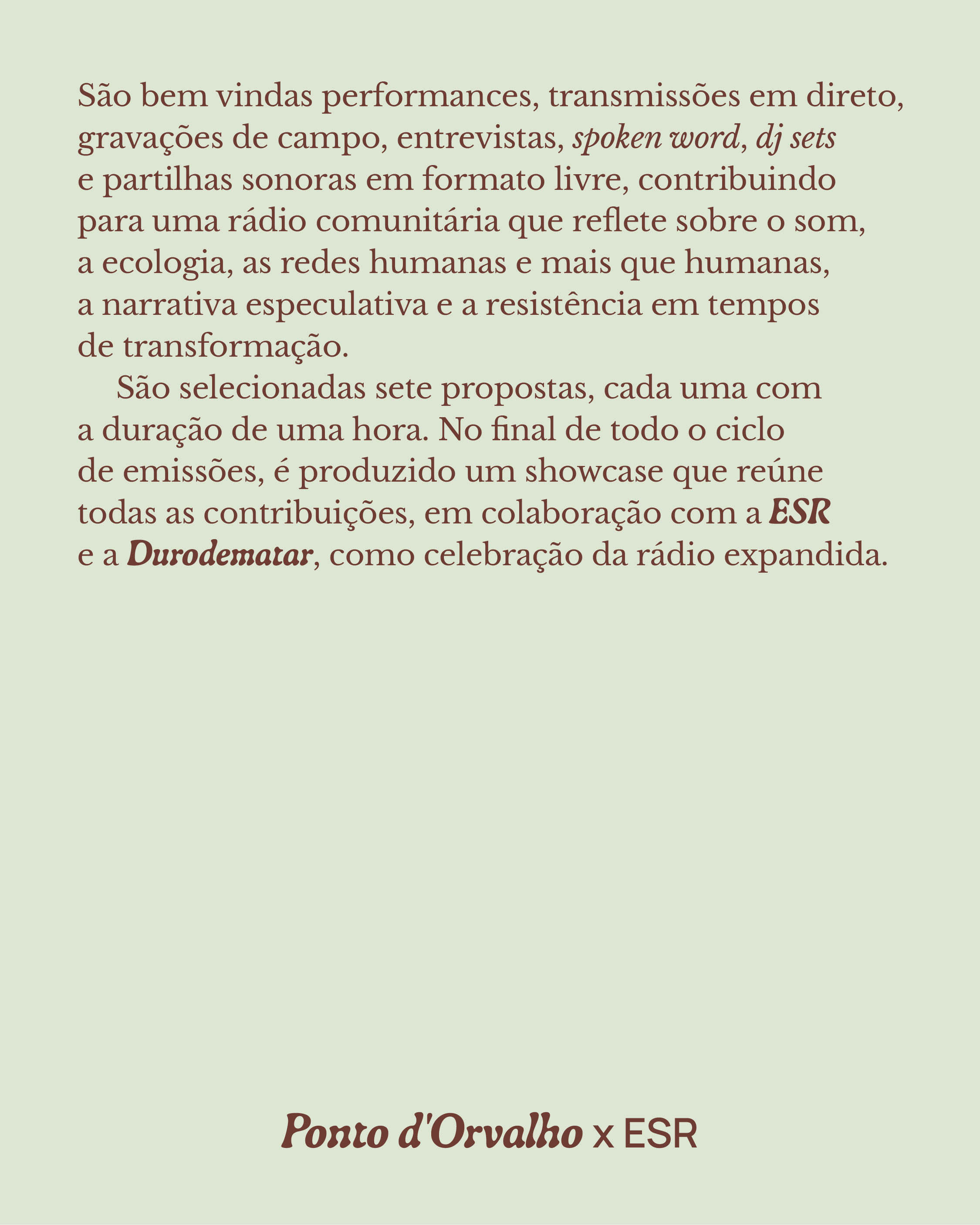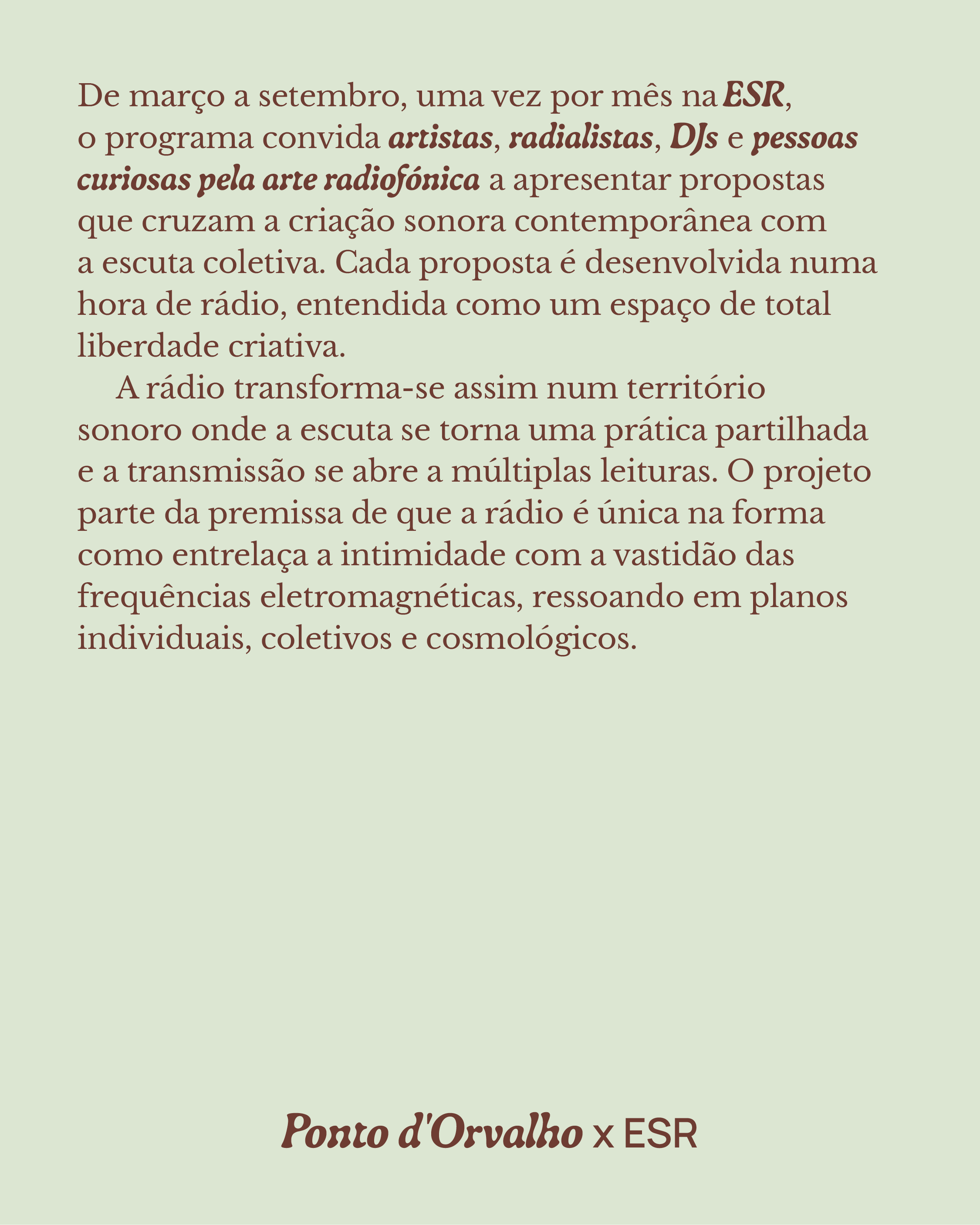 Gotas d'Orvalho é uma extensão do festival que se manifesta num programa de rádio mensal na ESR — https://esr.li